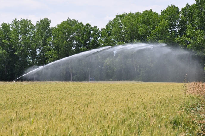 En cas de périodes sèches au printemps, nous arrosons notre blé de manière à ce que ses besoins en eau de 2,5 à 3 mm par jour soient satisfaits.